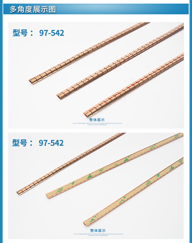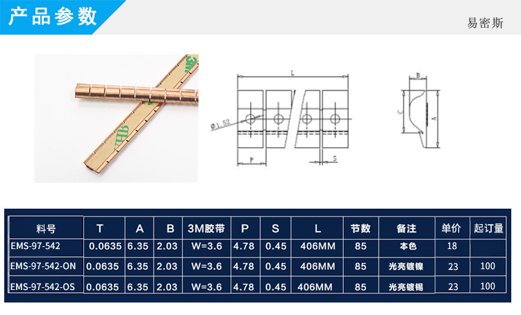 易密斯™鈹銅簧片由具有電磁兼容屏蔽效果的進(jìn)口鈹銅合金C17200制成,具有優(yōu)秀的抗壓性、回彈性和耐腐蝕性,并提供很好的寬頻電磁屏蔽效果,特別適用于通訊機(jī)柜、電腦、屏蔽室/門、面板及插拔件的間隙填充。易密斯™鈹銅簧片現(xiàn)有60余款標(biāo)準(zhǔn)件可供選擇,同時(shí)可支持定制。