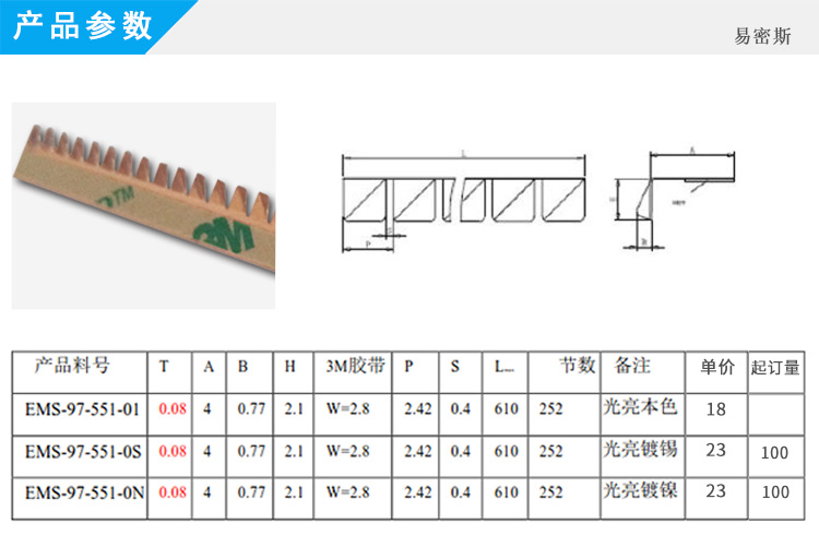 易密斯™鈹銅簧片由具有電磁兼容屏蔽效果的進口鈹銅合金C17200制成,具有優(yōu)秀的抗壓性、回彈性和耐腐蝕性,并提供很好的寬頻電磁屏蔽效果,特別適用于通訊機柜、電腦、屏蔽室/門、面板及插拔件的間隙填充。易密斯™鈹銅簧片現(xiàn)有60余款標準件可供選擇,同時可支持定制。