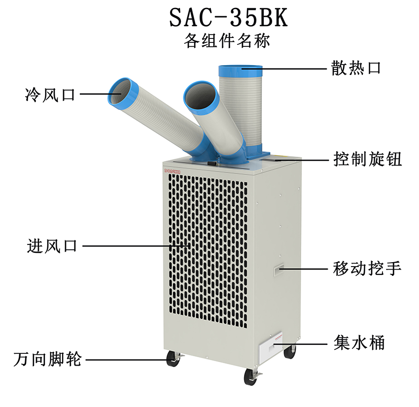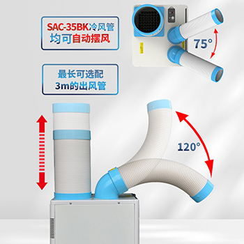 冷風(fēng)管可在一定范圍內(nèi)任意彎曲,大角度旋轉(zhuǎn)。兩根冷風(fēng)管均可左右自動(dòng)擺風(fēng)。